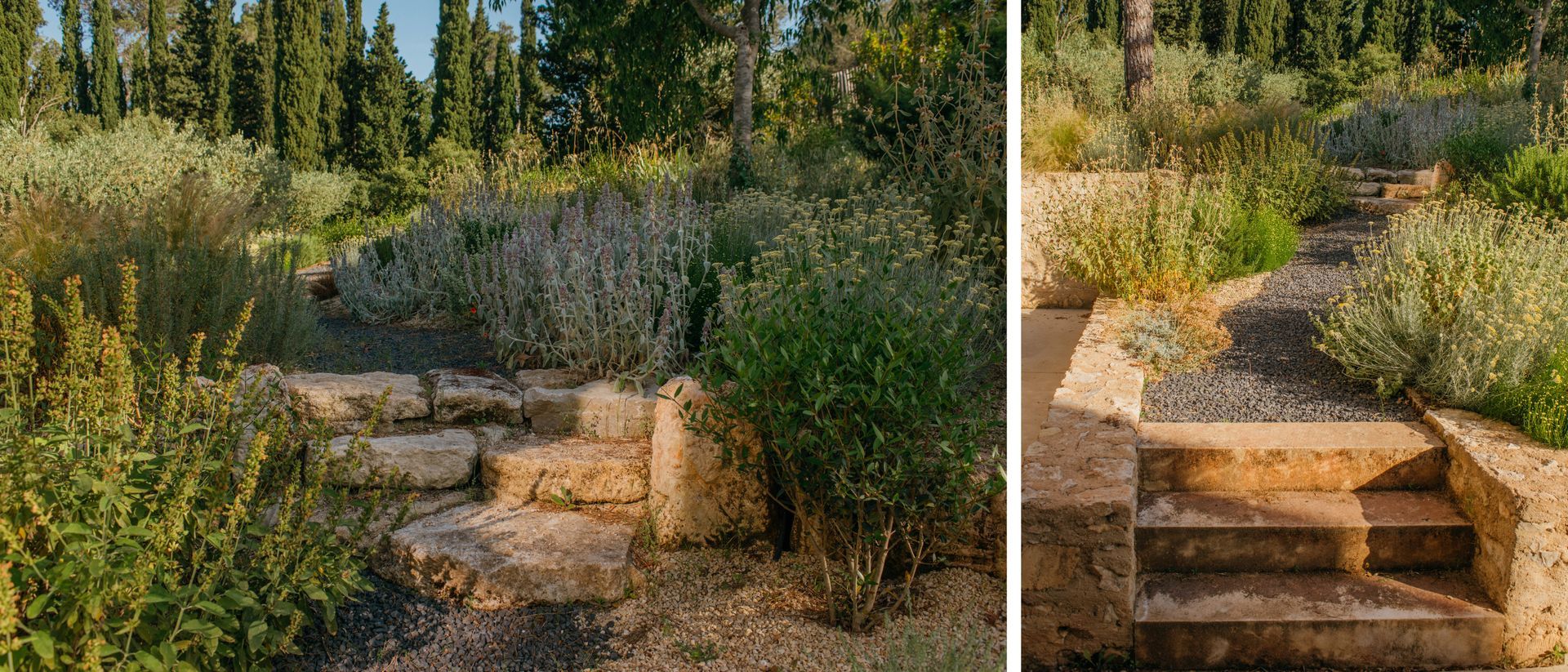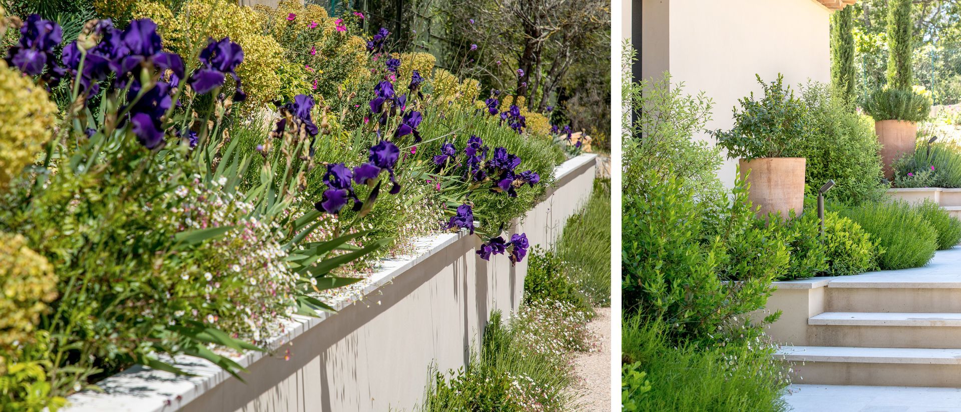 Ce jardin méditerranéen, offrant une vue sur les villages perchés du pays de Fayence donne le sentiment de se promener dans une garrigue domestiquée. Les cheminements serpentent à travers les massifs colorés, reliant habilement différents espaces : la piscine, le potager et le terrain de padel.