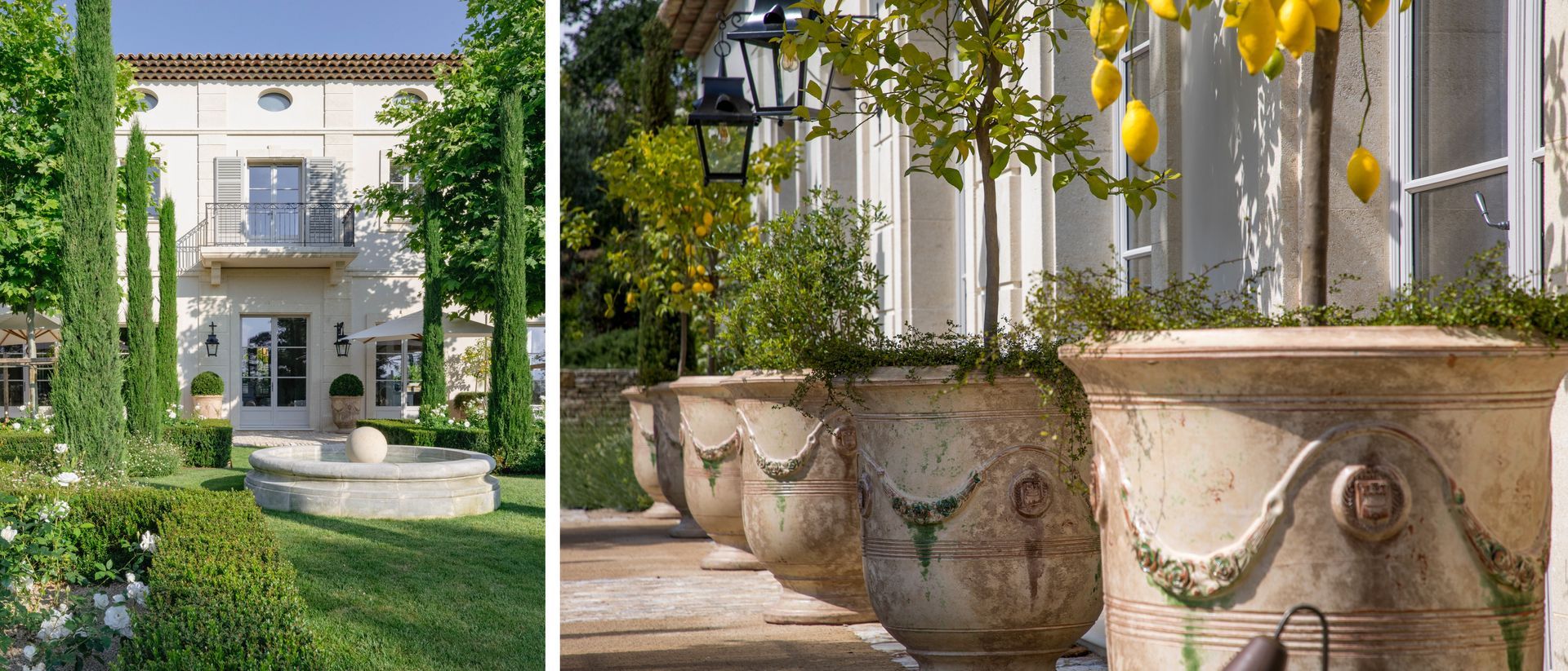 Les bassins, les fontaines et les pavés en pierre, chinés chez les revendeurs de matériaux anciens, insufflent l’authenticité indispensable à cet espace. Les poteries d’Anduze, patinées par le temps, ponctuent la façade et apportent de l’élégance aux terrasses de la propriété.